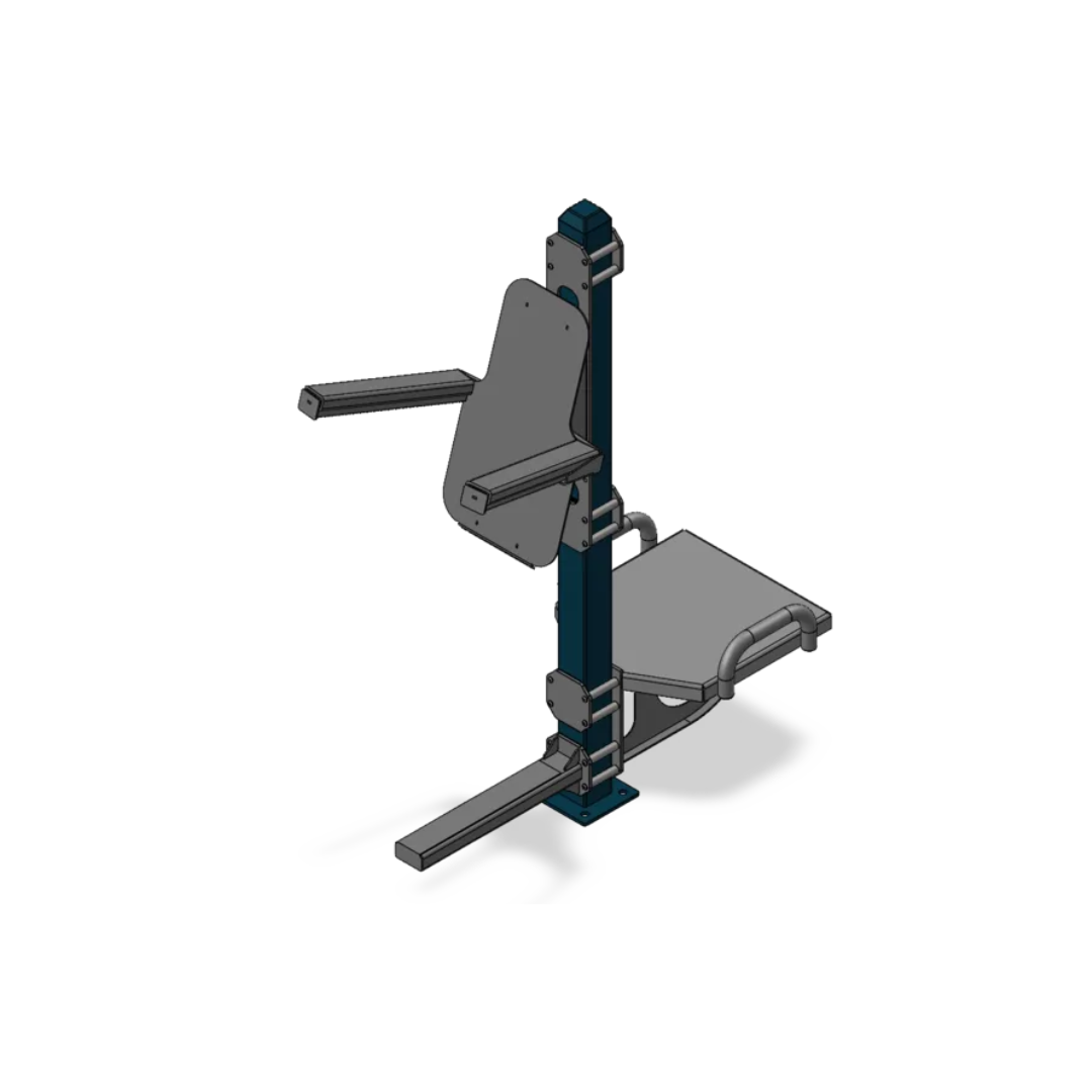 A single-post exercise system featuring a vertical knee raise and calf raise station on one side, and a plyo box with a support handle on the other. The plyo box height can be selected to suit different training needs.