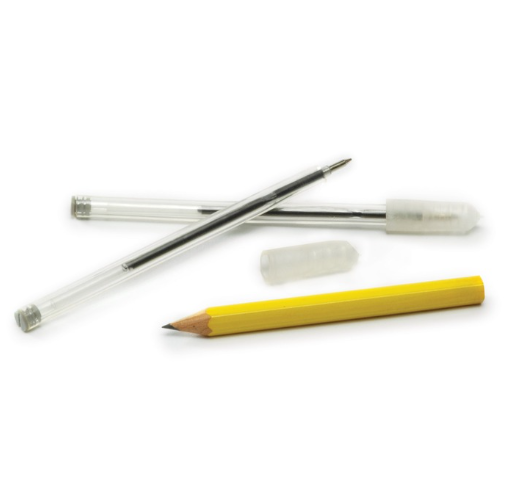 • 4” flexible clear pens with clear cap, offered in blue or black ink